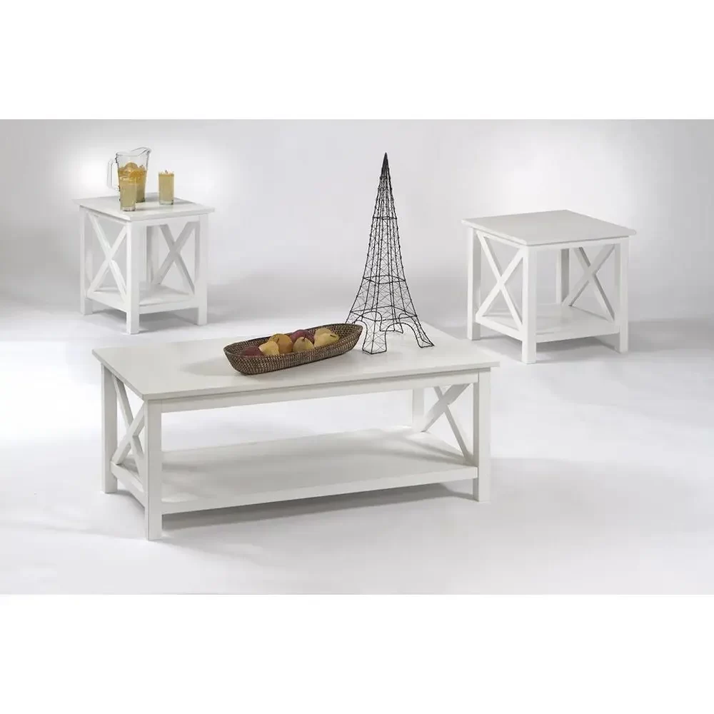Includes cocktail table, end table & chairside table X shaped ends Lower base shelves on each table