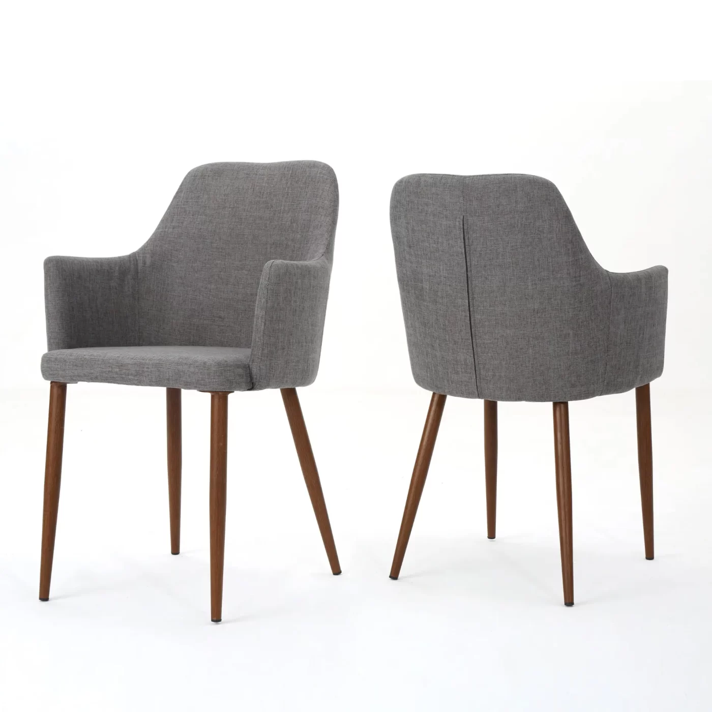 A slight Twist on a Classic look, these dining chairs offer you contoured support without sacrificing anything in style. Made from high-quality fabric over an iron frame with a wood Finish, giving you the aesthetic look of wood with the durability of metal, these chairs are designed to last you through countless dinner parties