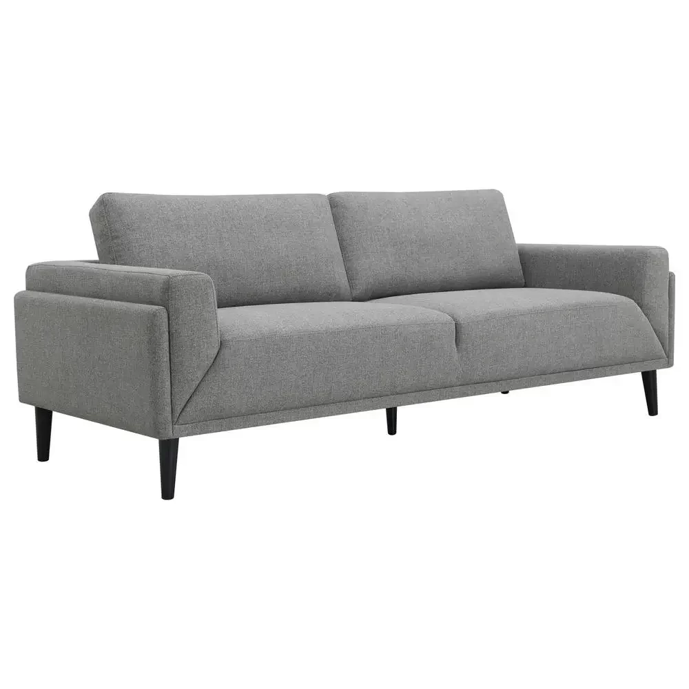 Welcome to the pinnacle of modern design with our sofa collection, where elegance meets innovation in a “frame within a frame” concept. This series, draped in a chic fabric, showcases an exquisite blend of clean lines accentuated by detailed topstitching. The track arms, enhanced with mitered front accents, further amplify its contemporary aesthetic. Prioritizing your relaxation, these sofas come equipped with reversible back cushions and a pocket coil seat construction, guaranteeing both coziness and lasting support. Elevating the design even further are the tall, black cylinder-shaped wooden legs, adding a touch of sophistication. This collection is not just about seating; it’s an embodiment of style and comfort, curated for the modern home.