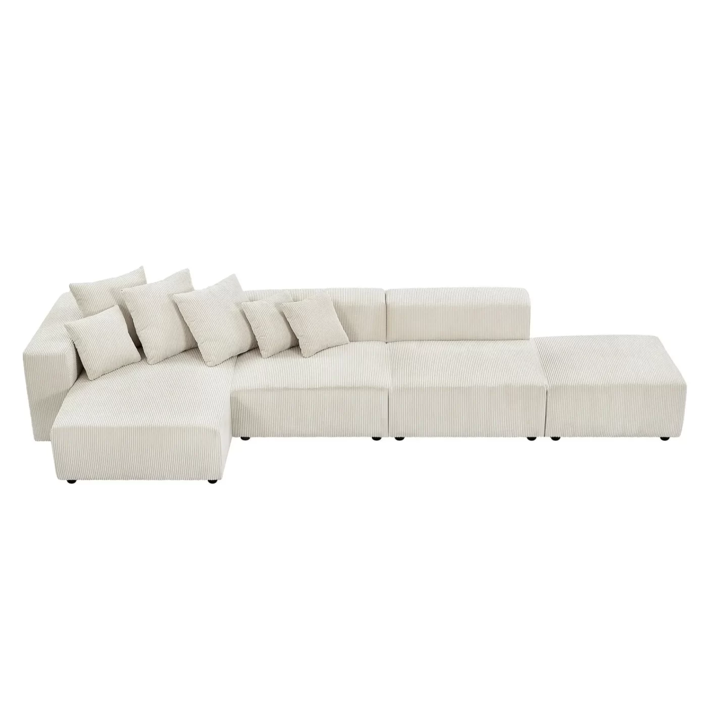 Modular 3-piece design includes chaise, armless chair, and ottoman; seats up to 4, comes with 4throw pillows(2 big and 2 small). The modern sofa couch measures W118.11 x D59.05 x H25.59. Compact furniture is ideal for small spaces.