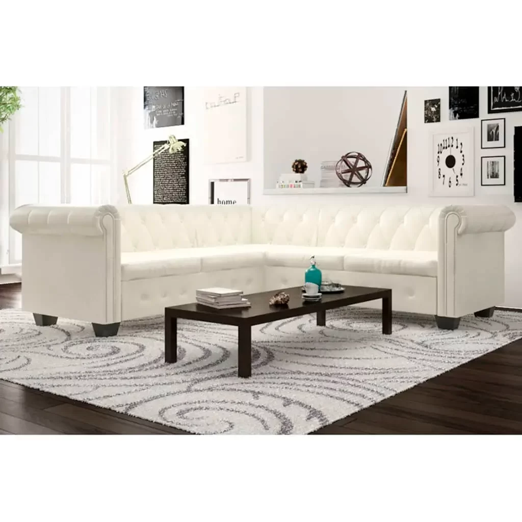 This chic 5-seater Chesterfield corner sofa is a fab mix of style and comfort, made to spice up any indoor space. With its sleek white faux leather cover and classic tufted look, this sofa sets a classy tone whether it’s in your living room or office, blending function with modern style.